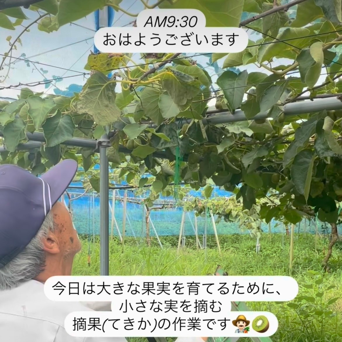 おはようございます!今日は、果実を大きくするための摘果作業です。